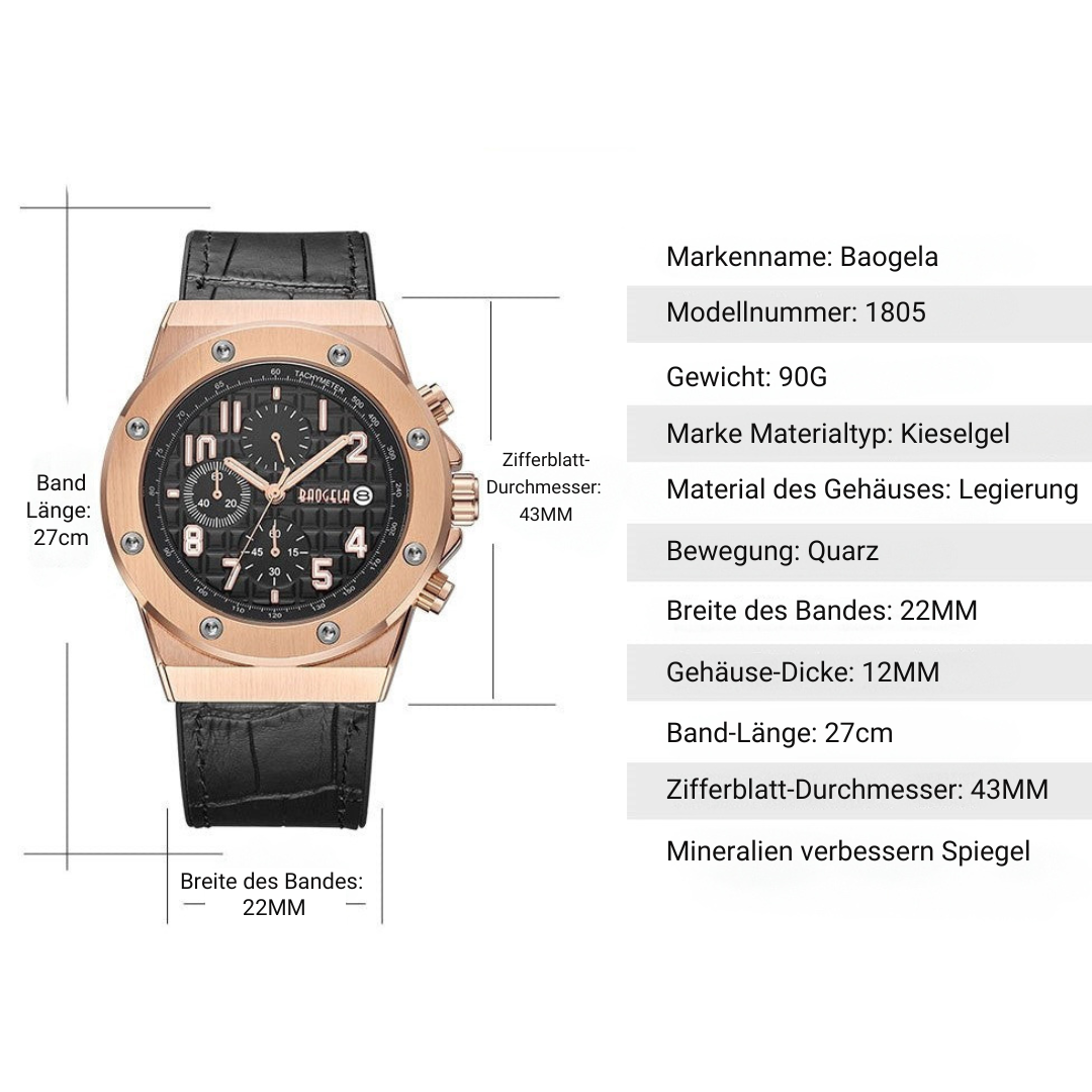 Det ægte læderarmbånd sikrer en behagelig bæreoplevelse med et samtidig, selvsikkert udtryk. Luminøse visere, kronograffunktion og et pålideligt kvartsurværk fuldender det tekniske indre – klar til at nå hvert mål med stil.