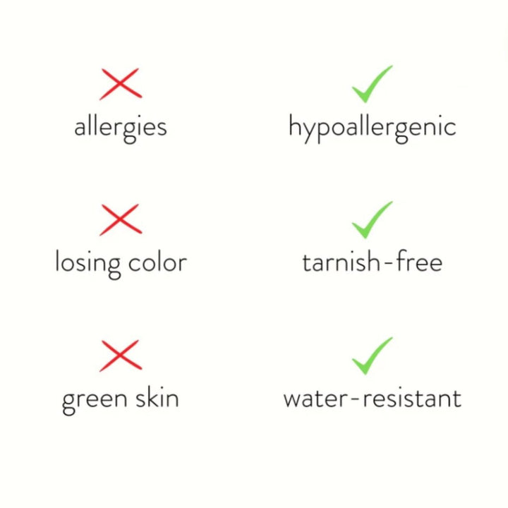 Bekymr dig ikke om grønne fingre, misfarvninger eller mathed – vores ring er lavet af mattebestandig rustfrit stål, hypoallergenisk, blyfri og nikkelfri.