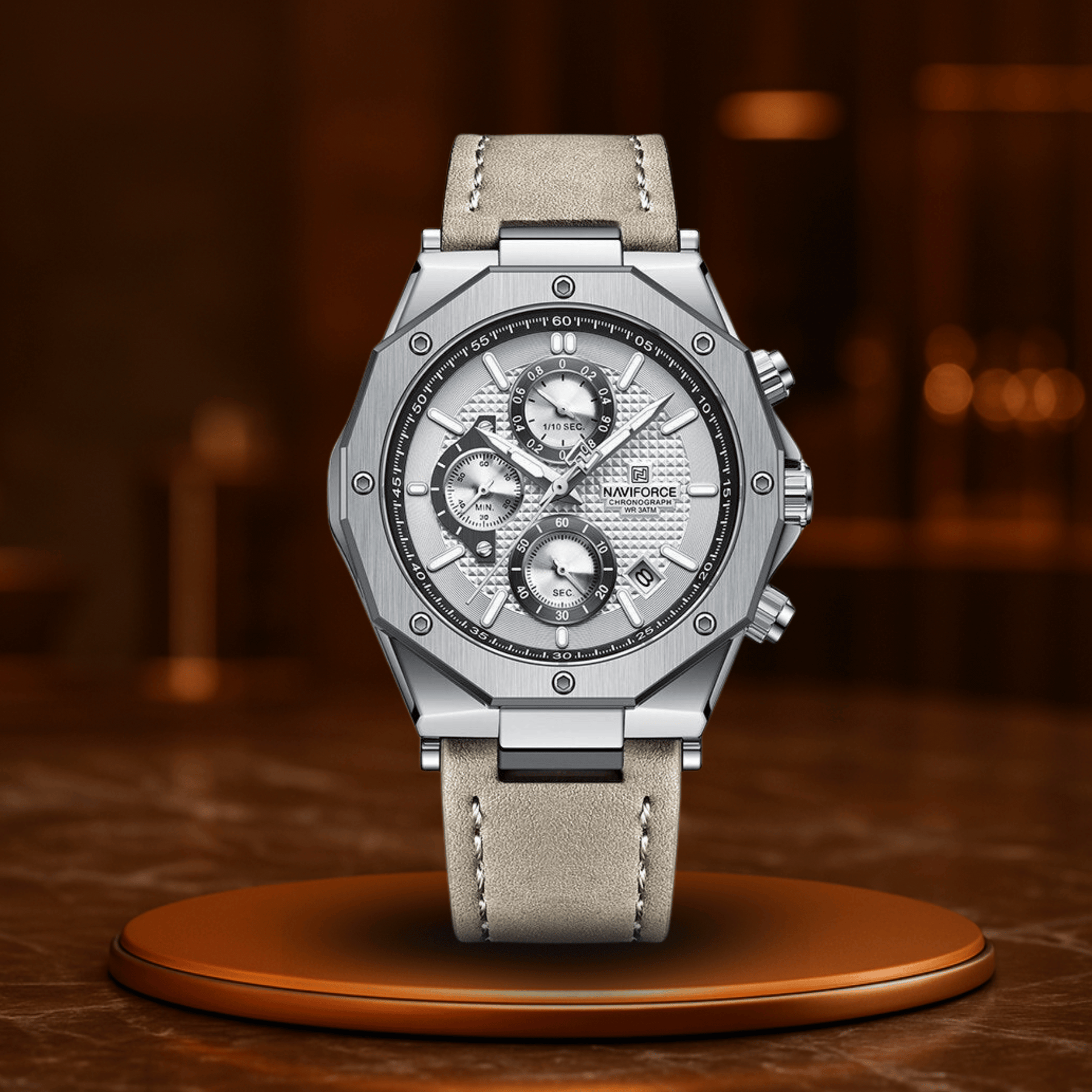 Den Ironhide Chrono er mere end blot en tidsmåler – den er en erklæring til verden. Bygget til mænd, der ikke går på kompromis, forener den modstandsdygtigheden fra militært udstyr med elegancen i moderne urhåndværk. Det robuste læderarmbånd sidder behageligt, og det 42 mm store urkasse virker til stede, uden at være højlydt – præcis som dens bærer.