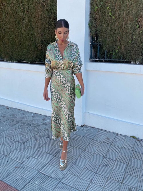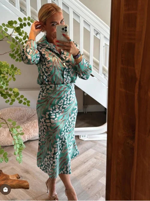 Lapinaya™ sættet består af en bluse og en nederdel med et fint gyldent eller bronzefarvet mønster, som giver et elegant udtryk. Det fås i en frisk grøn farve og en blød rosa nuance – perfekt til både hverdagsbrug og særlige anledninger.