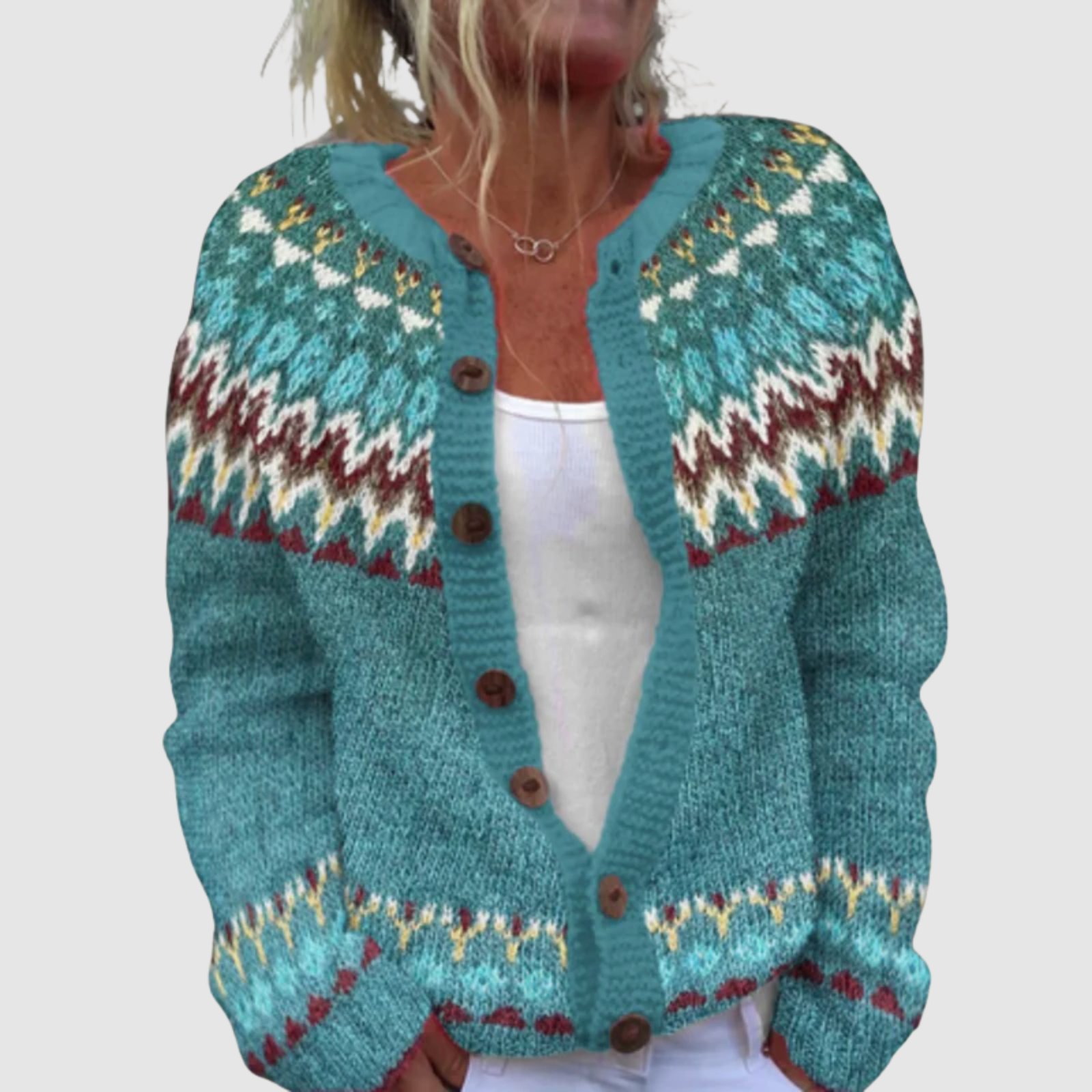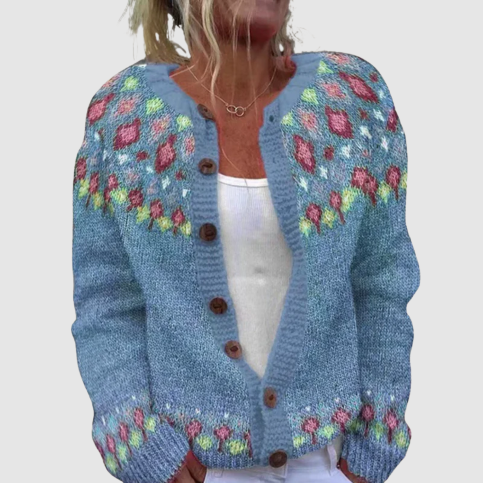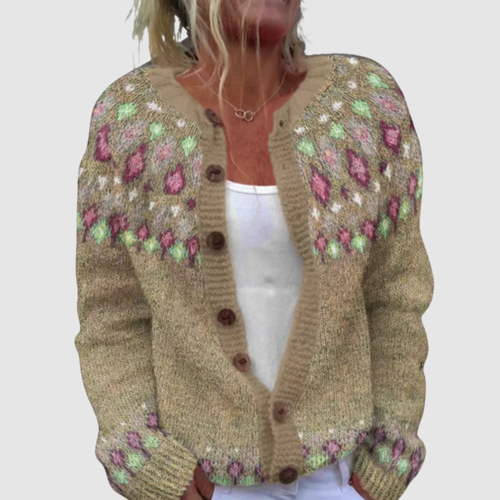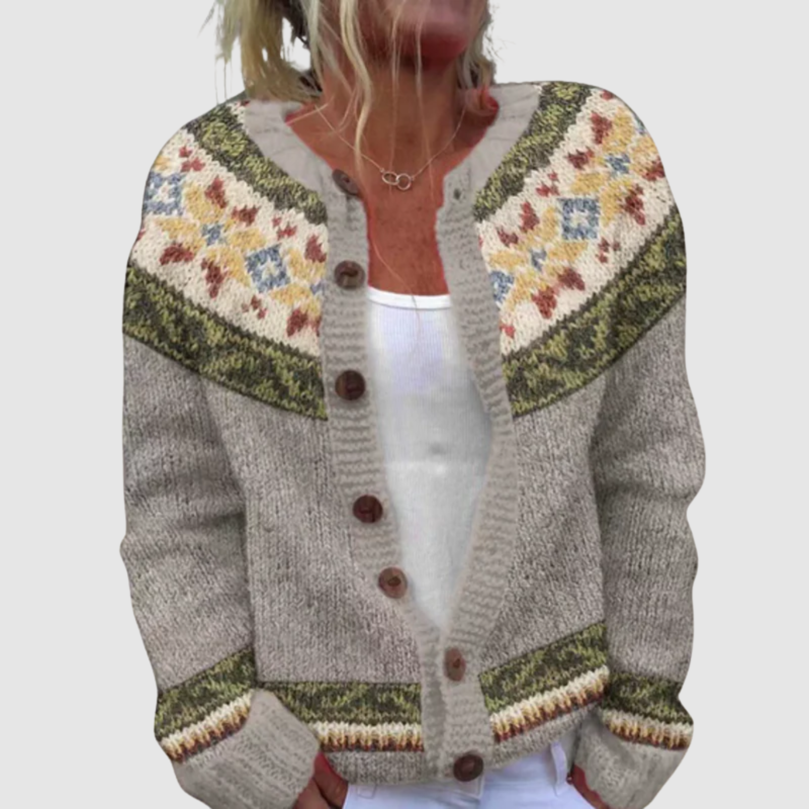 Et hyggeligt og stilfuldt vest, der kombinerer blød komfort med et charmerende mønster. Det løst strikkede design giver et afslappet udseende, perfekt til friske dage eller som et ekstra lag over din yndlingsbluse. Dekorative knapper og et farverigt mønster på skuldrene og ærmeenderne skaber et tidløst look.