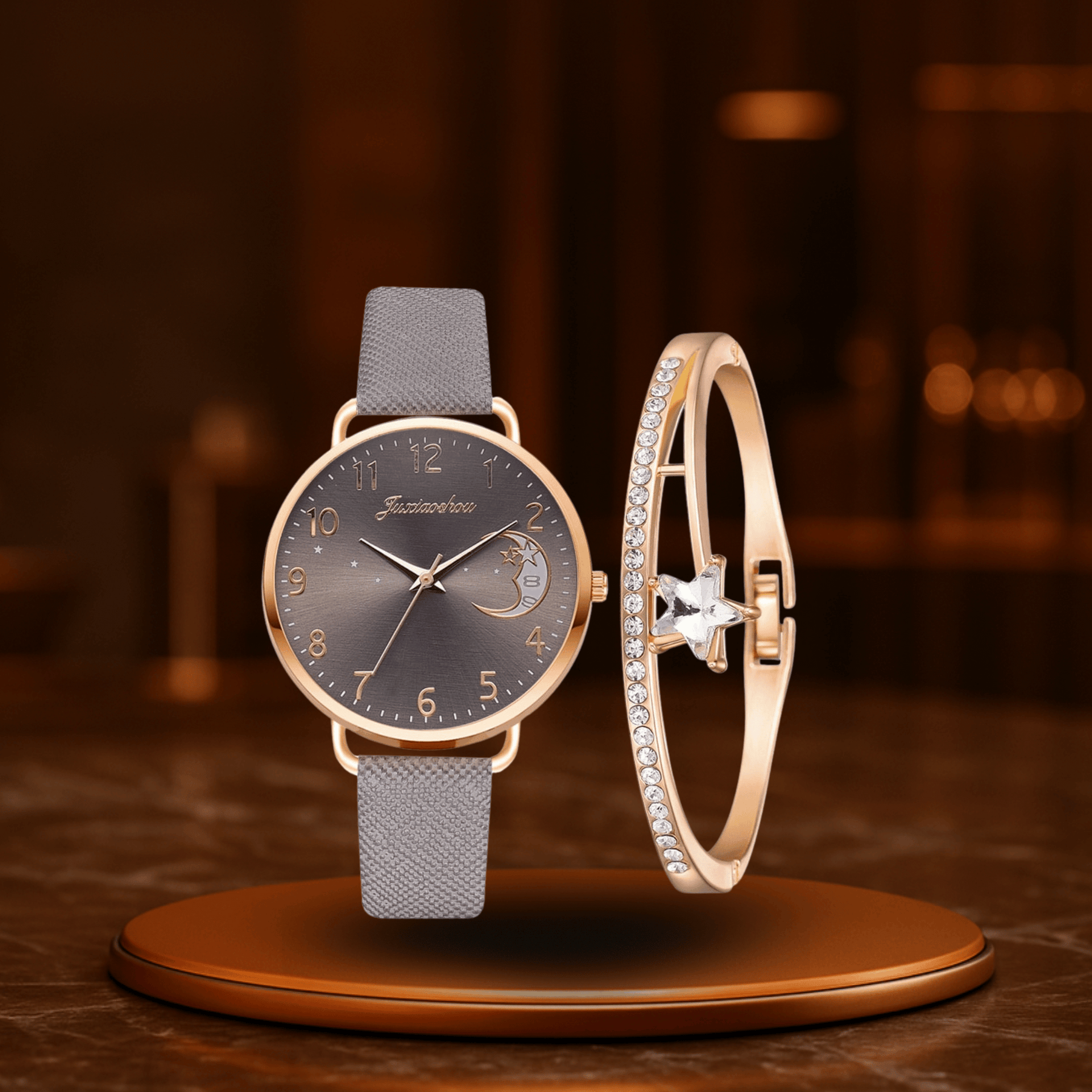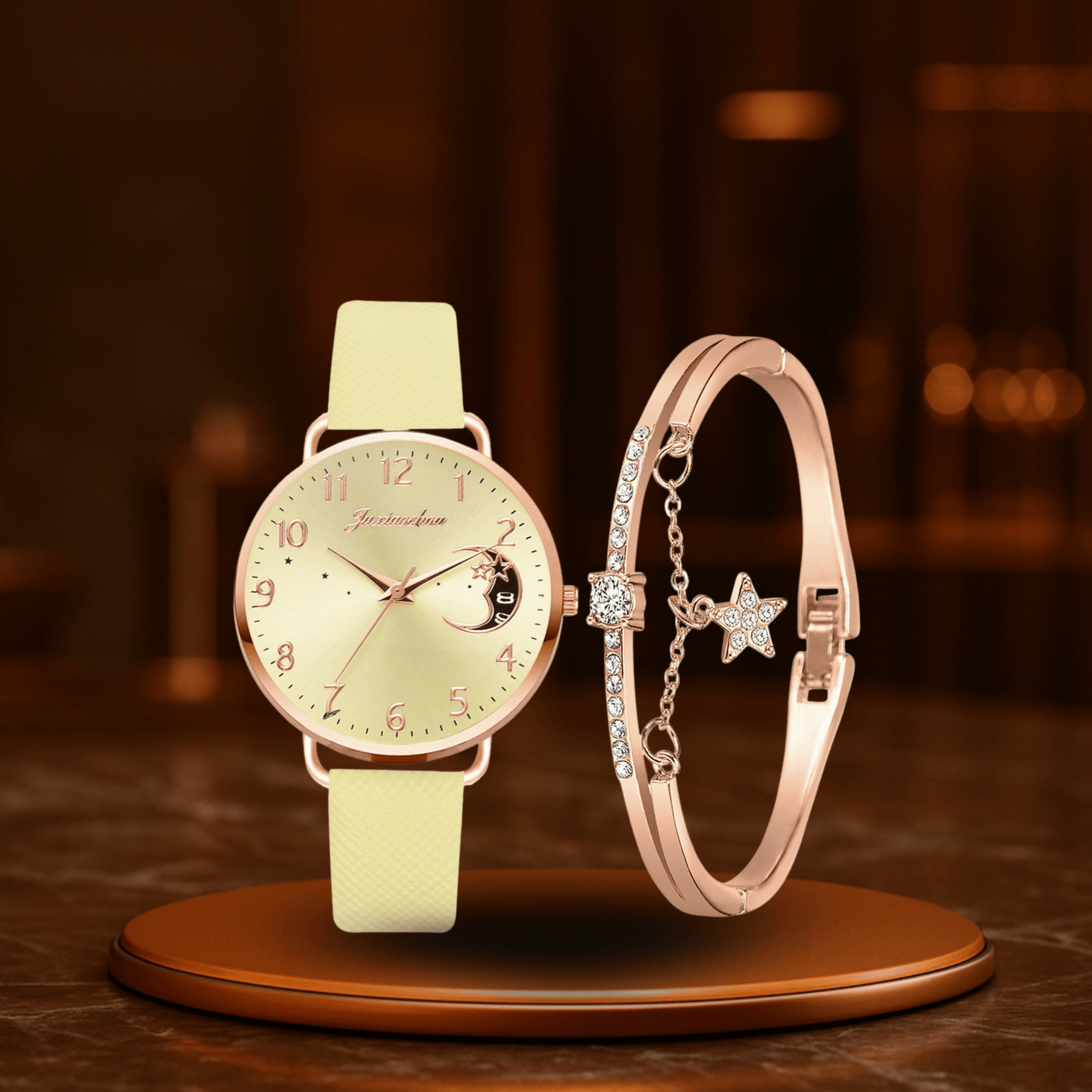 Det Lunaris Sæt forener månefaser, præcis kvarts-teknologi og elegante materialer i et design, der skinner både i hverdagen og ved særlige lejligheder. Den inspirerede urskive fra himmelens vidde og det raffinerede læderarmbånd giver et iøjnefaldende udseende – og det matchende armbånd tilfører dette mesterværk endnu mere glamour.