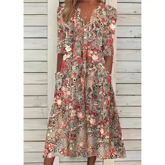 Sara kjole er en god blanding af stil og komfort. Med det feminine snit og blomsterprint ser du altid godt ud. Uanset om du skal på arbejde, til brunch eller ud at spise – kjolen passer til alle lejligheder.