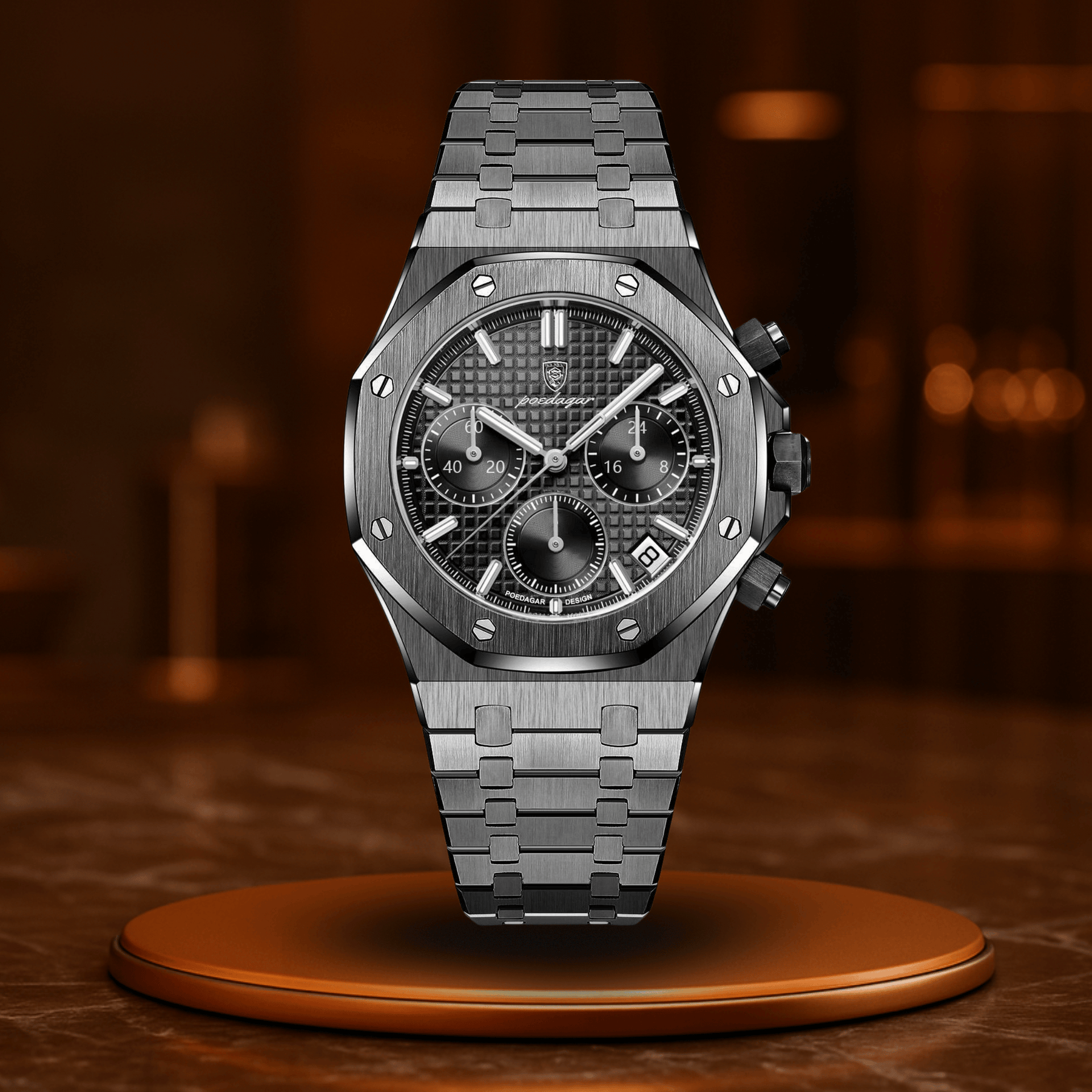 Den Serenade Black er mere end et stilfuldt accessory – det er en erklæring for mænd, der ikke behøver at forklare deres indflydelse. Med sit dyb-sorte urkasse, det massive rustfri stålarmbånd og et præcist kvarts-chronographværk, legemliggør den suveræn tilbageholdenhed på højeste niveau.